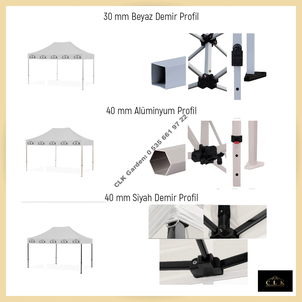 İmalatçı firma CLK TİCARET güvencesi ile %100 su geçirmez Oxford kumaş ile üretilmiş, branda ve iskelet garantili katlanabilir gazebo çadırları.